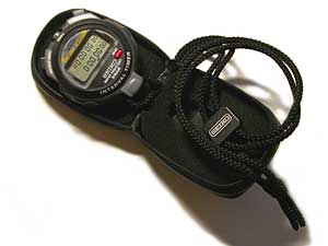 実験用に私的に購入した、不用意に落としても壊れそうもないデザインの3気圧防水のストップウォッチ。デジタル製品ですから当然といえますが、ストップウォッチの機能の他、時計、タイマーとして使えます。20年近く前に入手した製品で、1983年登場のG-shock